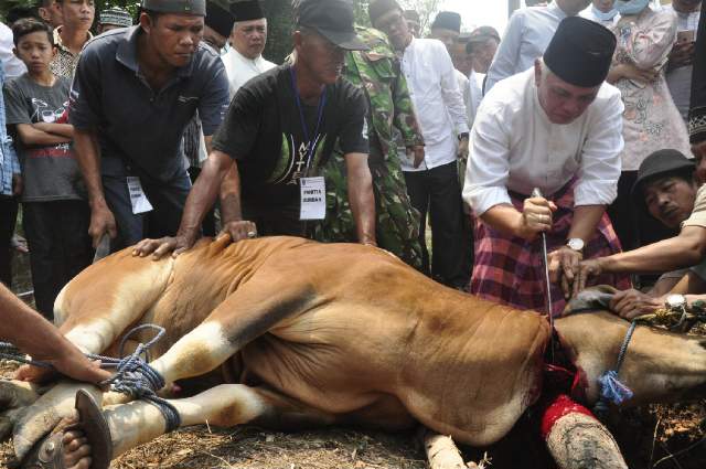Tokoh nasional asal Jejawi OKI, Hatta Rajasa melalukan penyembelihan hewan kurban di Halaman Masjid At Tohirin Jejawi, Kamis (24/9). Daging kurban tersebut kemudian dibagikan kepada warga masyarakat di desa sekitar
