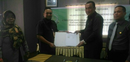 Nota Kesepahaman tersebut di tuangkan dalam Momerandum Of Understanding (MoU) yang ditanda tangani oleh Ketua KPU Dedi Irawan S.IP dan Kepala Kejaksaan Negeri OKI Viva Hari Rustaman SH MH.