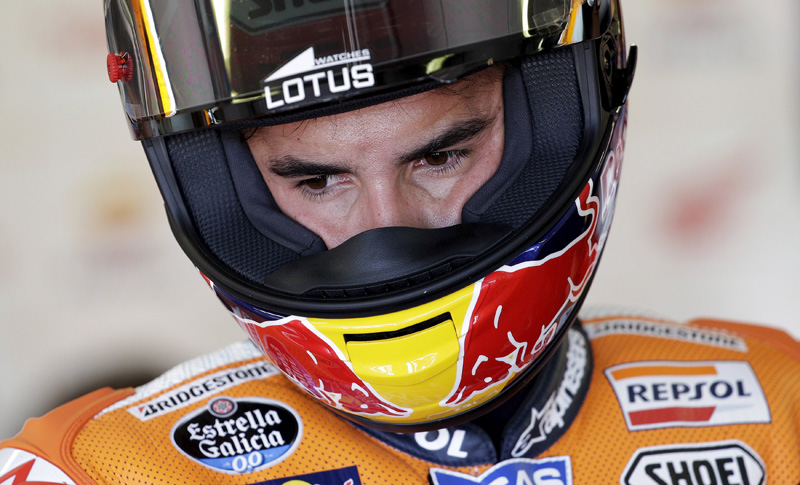 Honda MotoGP rider Marc Marquez of Spain looks on in the box during the second free practice of the San Marino Grand Prix in Misano Adriatico circuit in central Italy, September 11, 2015. REUTERS/Max Rossi