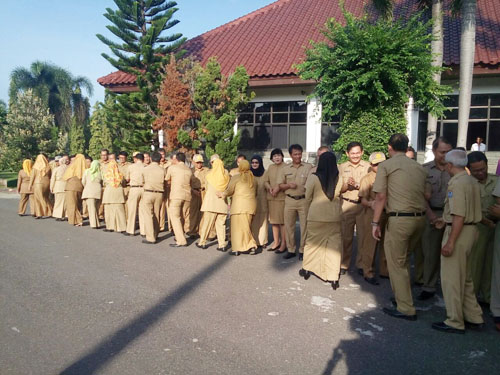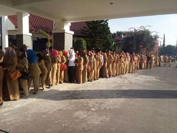 Terpantau, antrean sudah sepanjang sekitar 20 meter saat beberapa menit usai apel mingguan. ASN berseragam coklat muda sudah ‘mengular’ di halaman kantor bupati.