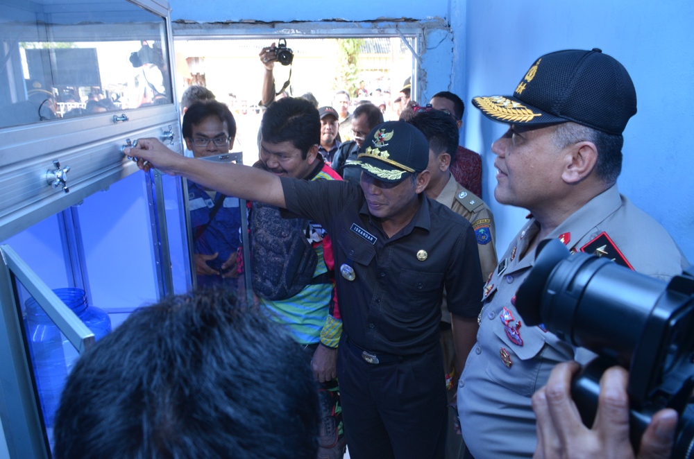 Kayuagung—Warga desa Sungai Menang Kecamatan Sungai Menang Kabupaten Ogan Komering Ilir, Sumsel kini bisa menikmati air bersih siap minum. Program air bersih melalui alat water treatment process (WTP) yang merupakan bantuan CSR Pt Sampoerna Agro ini diresmikan Bupati OKI, Iskandar, SE, bersama Kapolda Sumsel, Irjend. Pol. Prof. Iza Fadri, S. IK dan Managing Direktur PT Sampoerna Agro, Parluhutan Sitohang di Desa Sungai Menang, Selasa (28/4).