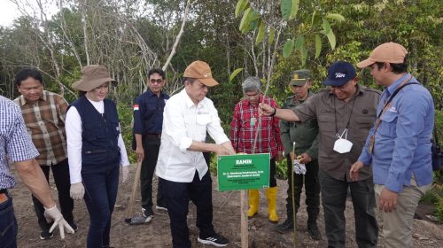 Sekretaris Jenderal sekaligus Plt. Direktur Jenderal Konservasi Sumber Daya Alam dan Ekosistem (KSDAE) KLHK Bambang Hendroyono berkunjung ke salah satu site kerjasama di Suaka Margasatwa Padang Sugihan (19/3). Kerja sama antara Balai KSDA Sumatera Selatan dengan PT OKI Pulp & Paper Mills tertuang dalam perjanjian Nomor PKS.1150/K.12/TU/REN/7/2020 dan Nomor 09/CAD-OKI/EM/07/2020 tentang Penguatan Fungsi Berupa Dukungan Pemulihan Ekosistem dan Penanggulangan Kebakaran di Suaka Margasatwa (SM) Padang Sugihan Provinsi Sumatera Selatan