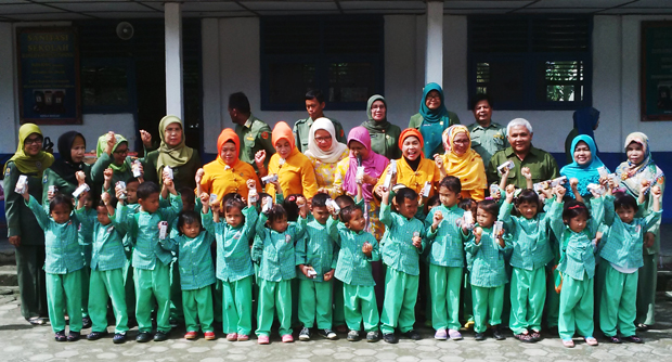 Bantuan berupa susu dan telur tersebut diberikan kepada 900 murid, diantaranya murid TK Azahra, SDN 1 Mangun Jaya, SDN 1, 2 dan 3 Terusan Menang.